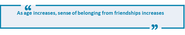 Considering our initial thoughts about Social Penetration theory (Altman & Taylor, 1973) and the hypothesis that age may bring deeper levels of self-disclosure and thus sense of belonging within friendships. The results show us that levels of considerable sense of belonging are witnessed across the life span, this demonstrates that we can feel satisfaction and reciprocity from interpersonal relationships at any age. That age is not the deciding factor as to whether we will achieve a sense of belonging or how deep and responsive this may be.